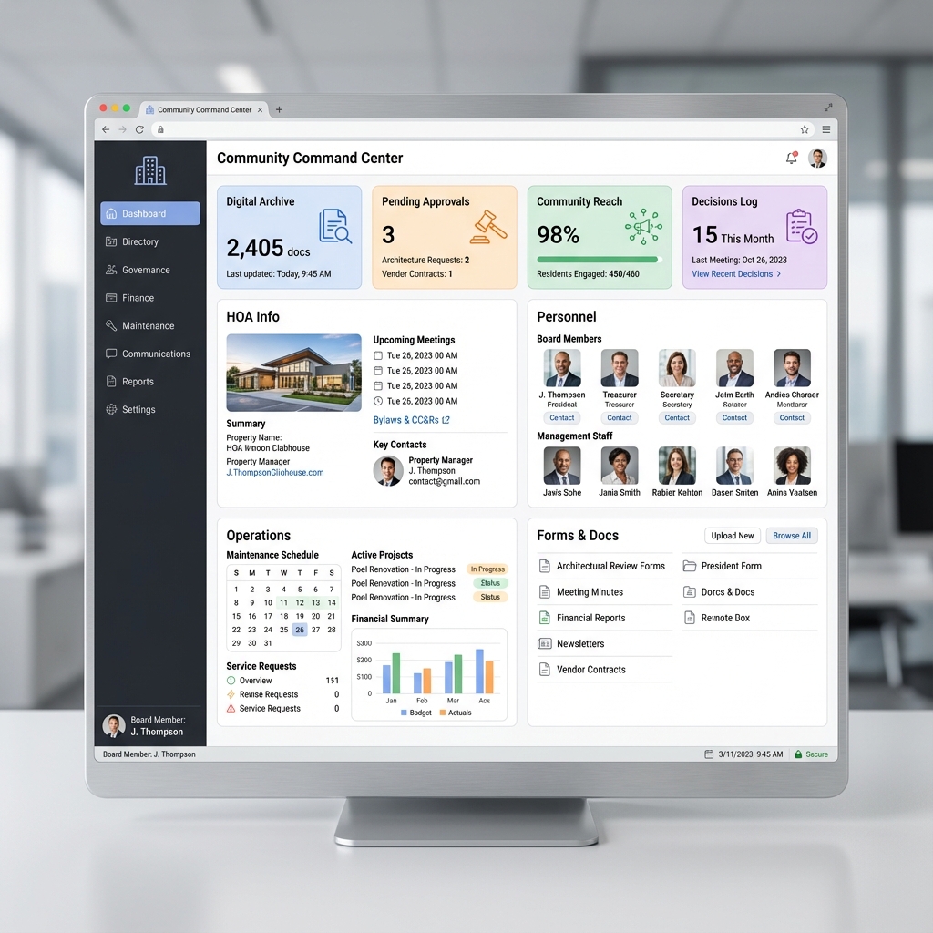 Boards love you because you bring order. They get a free, powerful dashboard to manage their community, documents, and requests.